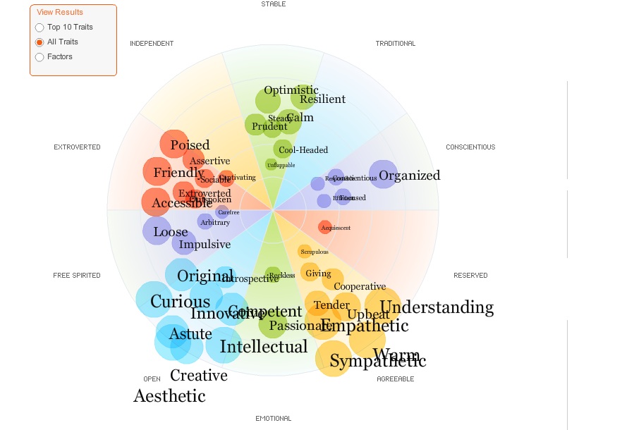 You are good at solving problems, coming up with original ideas, and seeing connections between things, connections that most other people miss. People with a high score on the “creative” trait often are employed in such fields as finance and scientific research, and enjoy avant garde and classical music as well as literary fiction and scholarly non-fiction.