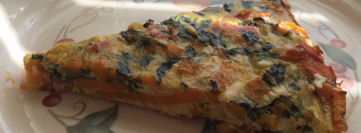Clearly you’ll want to dice the onion to go with the already-diced sweet potato and toss it into the pan at medium heat with some oil of your choosing (for me, I use avocado oil.) Once you give those an initial stir, chop up the spinach and black forest ham. When the onions become translucent and the sweet potato start to brown, throw in the spinach and ham to left that cook up. In the aforementioned bowl, whisk the eggs with a little bit of water and the dill. Once your spinach has had a chance to wilt a bit in the pan, add all of it into your egg mixture, add the Daiya, and give it a good stir. This should have given your crust enough time to brown in the oven, when the timer goes off, take out the crust and knock the heat back to 375. I let my crust breathe for a few minutes, just so the egg didn’t cook the second it hit the pan, it also gives the oven a chance to get to a lower temperature.